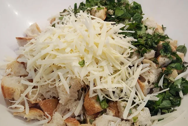 Add the minced herbs and 1 cup of the grated cheese to the microwaved vegetables and stir.