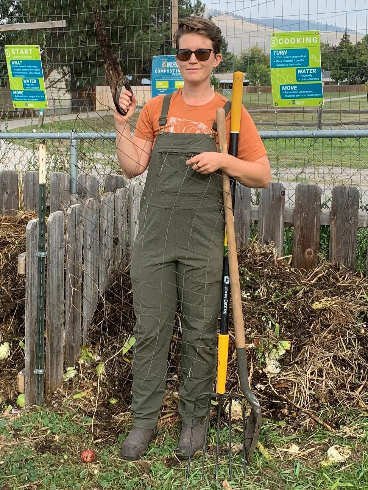 A four-bin compost system at the Bitterroot Line Community Garden. Fresh material is added to the left-most bin and turned to the right until it’s fully “cooked” in the right-most bin, where a gardener is taking some to add to their plot.
