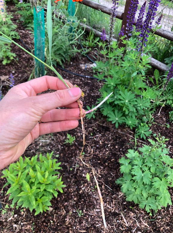 Quackgrass is grass with white, wire like roots and should be added to the weed pile. Use a digging fork to loosen the soil and make it easier to pull out the roots. Make sure you shake out any clumps of dirt.