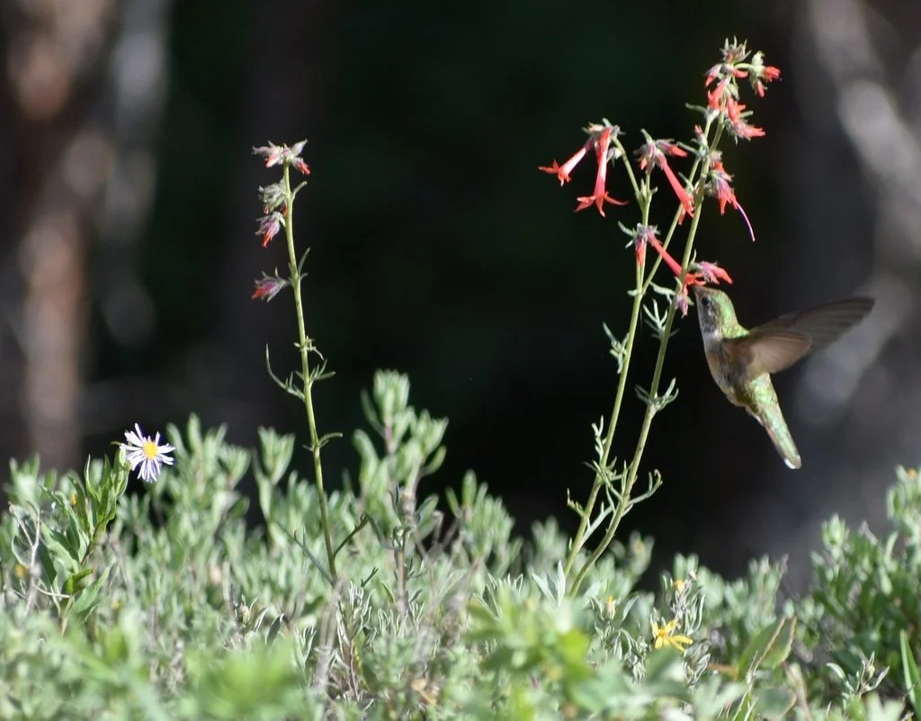 Hummingbirds seem to LOVE the color red. That’s why we see hummingbird feeder liquid sold solely in that color (experts now recommend providing fresh plain white sugar and water because it is much healthier for these little birds. It will need to be changed often). Hummingbirds have a more specialized and concentrated cone within their retinas, making them more attracted to bright primary colors such as red and yellow. There is also another working hypothesis that hummingbirds often get more “bang-for-their-buck” from red and yellow flowers regarding the flowers’ nectar have a higher sugar concentration. Hummingbirds are not attracted to flowers by scent, so flowers that hummingbirds primarily pollinate often do not have strong smells. Because Hummingbirds have such long bills, they often specialize in pollinating flowers that contain nectar deep in their calyx or spur. An example of a native flower species that attracts Hummingbirds in the Missoula area is the Scarlet Gilia, Ipomopsis.