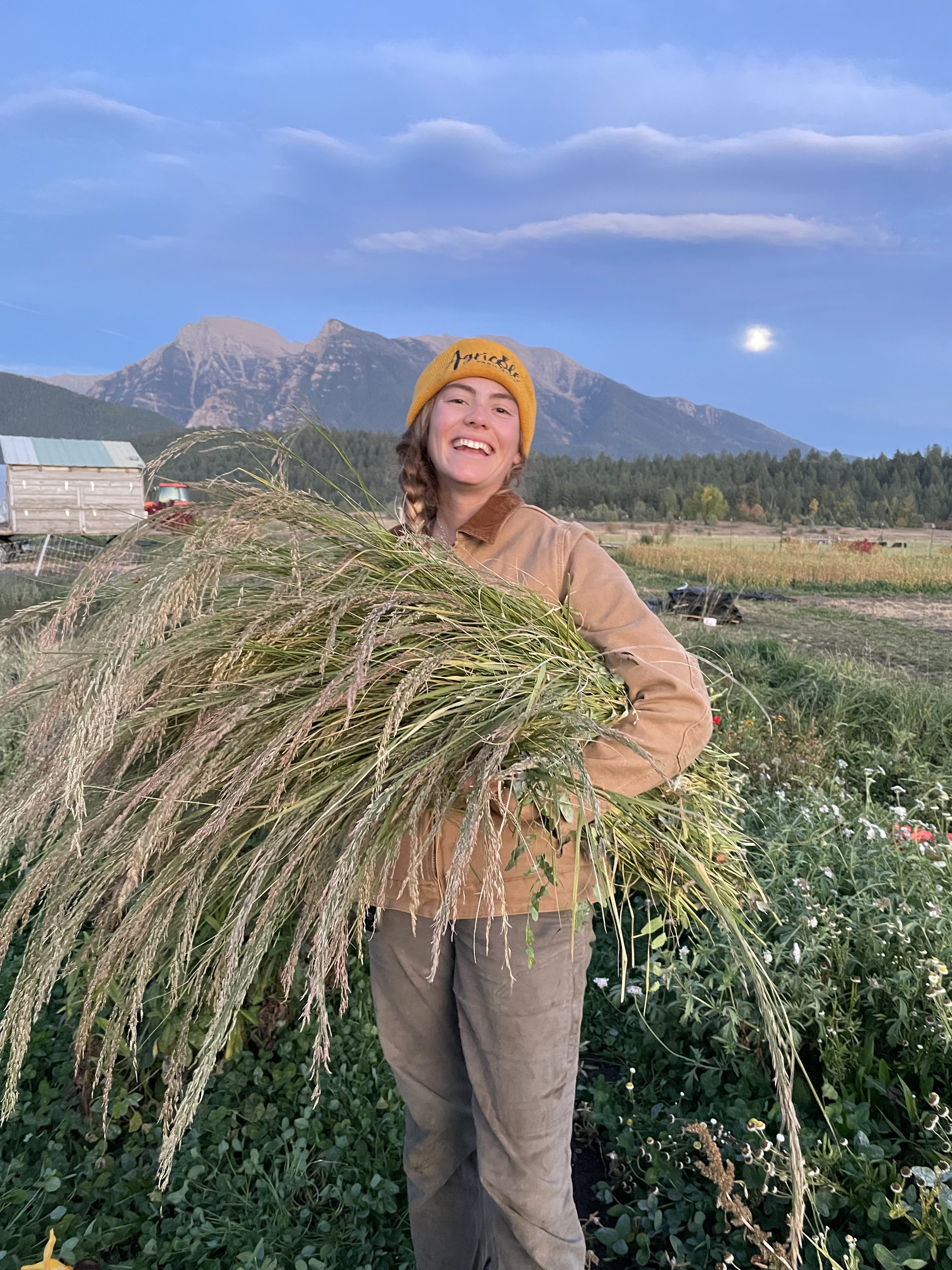 Jamie holding a bundle of grass smiling as the moon rises behind the Mission Mountains.